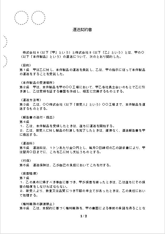 運送契約書 株式会社A(以下「甲」という)と株式会社B(以下「乙」という)とは、甲の○(以下「本件製品」という)の運送について、次のとおり契約した。 (目的) 第1条 甲は乙に対し、本件製品の運送を委託し、乙は、甲の指示に従って本件製品の運送をすることを受託した。 (本件製品の受渡場所) 第2条 甲は、本件製品を甲の○○工場において、甲乙各社員立会いのもとで乙に引き渡し、乙は受領を証する書面を作成し、相互に交換するものとする。 (運送方法等) 第3条 乙は、○○株式会社(以下「荷受人」という)○○工場まで、本件製品を運送するものとする。 (報告書の送付・提出) 第4条 1.乙は、本件製品を受領したときは、直ちに運送を開始する。 2.乙は、荷受人に対し製品の引渡しを完了したときは、遅滞なく、運送報告書を甲に提出する。 (運送料) 第5条 運送料は、1トンあたり金○円とし、毎月○日締切の乙の請求書により、甲は翌月○日までに、これを乙に対し支払うものとする。 (付保) 第6条 運送保険は、乙が自己の負担においてこれを付する。 (損害賠償) 第7条 1.乙の責めに帰すべき事由に基づき、甲が損害を被ったときは、乙は直ちにその損害の賠償をしなければならない。 2.荷受人より、数量又は品質につき不服の申立てがあったときは、乙の責任において処理する。 (権利義務の譲渡禁止) 第8条 乙は、本契約に基づく権利義務を、甲の書面による事前の承諾を得ることなく第三者に譲渡してはならない。 本契約締結の証として、本書2通を作成し、甲乙記名押印のうえ、各1通を保有する。 平成○○年○○月○○日 甲 ○○県○○市○○町○丁目○番○号 株式会社 A 代表取締役 ○○ ○○ 乙 ○○県○○市○○町○丁目○番○号 株式会社 B 代表取締役 ○○ ○○