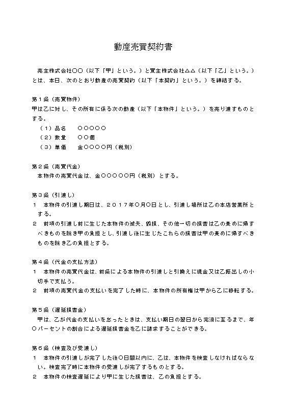 動産売買契約書 売主株式会社◯◯(以下「甲」という。)と買主株式会社△△(以下「乙」という。)とは、本日、次のとおり動産の売買契約(以下「本契約」という。)を締結する。 第1条(売買物件) 甲は乙に対し、その所有に係る次の動産(以下「本物件」という。)を売り渡すものとする。 (1)品名 ○○○○○ (2)数量 ○○個 (3)単価 金○○○○円(税別) 第2条(売買代金) 本物件の売買代金は、金○○○○○円(税別)とする。 第3条(引渡し) 1 本物件の引渡し期日は、2023年○月○日とし、引渡し場所は乙の本店営業所とする。 2 前項の引渡し前に生じた本物件の滅失、毀損、その他一切の損害は乙の責めに帰すべきものを除き甲の負担とし、引渡し後に生じたこれらの損害は甲の責めに帰すべきものを除き乙の負担とする。 第4条(代金の支払方法) 1 本物件の売買代金は、前条による本物件の引渡しと引換えに現金又は乙振出しの小切手で支払う。 2 前項の売買代金の支払いを完了した時に、本物件の所有権は甲から乙に移転する。 第5条(遅延損害金) 甲は、乙が代金の支払いを怠ったときは、支払い期日の翌日から完済に至るまで、年○パーセントの割合による遅延損害金を乙に請求することができる。 第6条(検査及び受渡し) 1 本物件の引渡しが完了した後○日間以内に、乙は、本物件を検査しなければならない。検査完了時に本物件の受渡しが完了するものとする。 2 本物件の検査遅延により甲に生じた損害は、乙の負担とする。 第7条(瑕疵担保責任) 1 乙は甲に対して、本物件の受渡し後○年間、本物件の引渡し前の原因によって生じた品質不良、数量不足、変質その他の瑕疵について、代品の納入、若しくは瑕疵の修補又は代金減額を請求することができる。 2 前項の瑕疵の存在によって本契約締結の目的が達成できない場合には乙は本契約を解除することができる。 3 前2項の場合においても、乙が甲に対して損害賠償請求をすることを妨げない。 4 第1項の瑕疵が直ちに発見できる瑕疵であり、前条の検査完了後乙が甲に対して通知をしなかった場合には、前項及び第2項の規定は適用しない。 第8条(損害賠償) 乙は、甲が本契約に定める義務を履行しないため損害を受けたときは、その損害の賠償を請求できる。 第9条(反社会的勢力の排除) 1 甲及び乙は、それぞれ相手方に対し、本契約締結時において、自ら(法人の場合は、代表者、役員又は実質的に経営を支配する者。)が暴力団、暴力団員、暴力団関係企業、総会屋、社会運動標ぼうゴロ又は特殊知能暴力集団その他反社会的勢力に該当しないことを表明し、かつ将来にわたっても該当しないことを確約する。 2 甲又は乙の一方が前項の確約に反する事実が判明したとき、その相手方は、何らの催告もせずして、本契約を解除することができる。 3 前項の規定により、本件契約を解除した場合には、解除した当事者はこれによる相手方の損害を賠償する責めを負わない。 4 第2項の規定により、本件契約を解除した場合であっても、解除した当事者から相手方に対する損害賠償請求を妨げない。 第10条(解除) 甲及び乙は、相手方が本契約で定める義務を履行しないときは、何らの催告及び自己の債務履行の提供を要することなく直ちに本契約を解除することができ、損害賠償を請求できる 第11条(合意管轄) 本契約に関する一切の紛争は、○○地方裁判所を第一審の専属的合意管轄裁判所とする。 本契約の成立を証するため、本書2通を作成し、甲乙記名押印のうえ、各自その1通を所持する。 令和○○年○○月○○日 甲 ○○県○○市○○町○丁目○番○号 株式会社 A 代表取締役 ○○ ○○ 乙 ○○県○○市○○町○丁目○番○号 株式会社 B 代表取締役 ○○ ○○