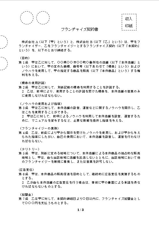 株式会社A(以下「甲」という)と、株式会社B(以下「乙」という)は、甲をフランチャイザー、乙をフランチャイジーとするフランチャイズ契約(以下「本契約」という)を、以下のとおり締結する。