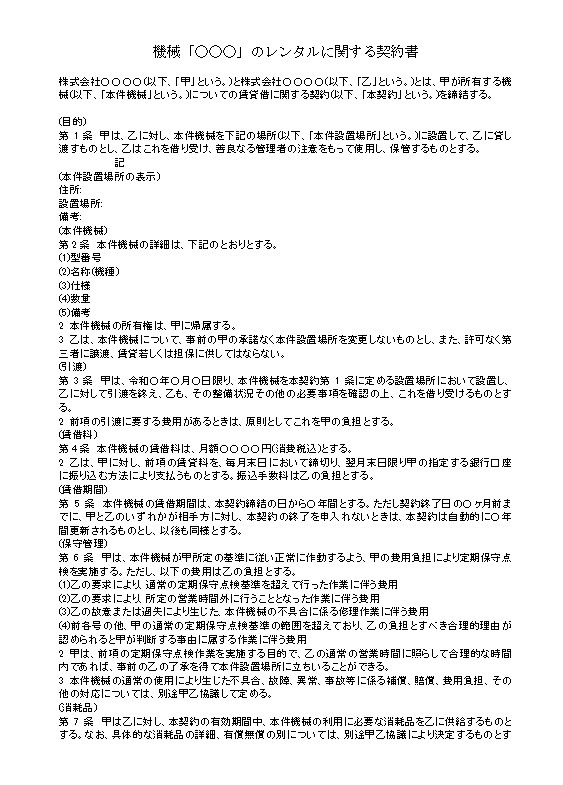 機械「○○○」のレンタルに関する契約書