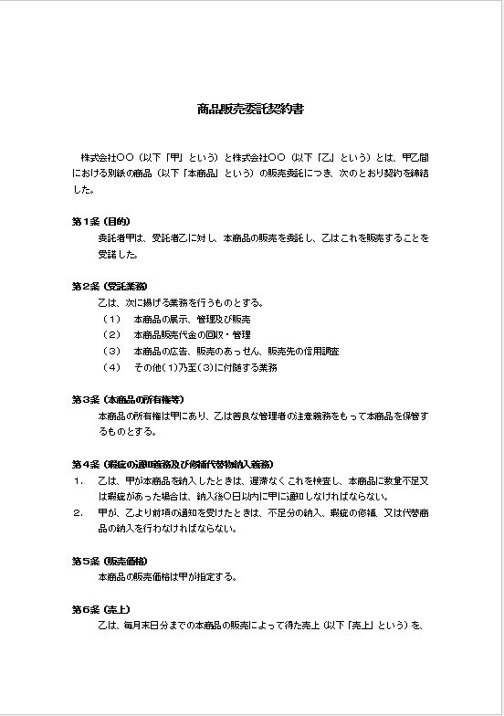 株式会社○○(以下「甲」という)と株式会社○○(以下「乙」という)とは、甲乙間における別紙の商品(以下「本商品」という)の販売委託につき、次のとおり契約を締結した。