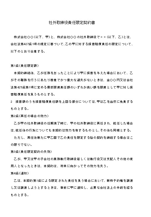 株式会社〇〇(以下、甲)と、株式会社〇〇の社外取締役で××(以下、乙)とは、会社法第427条1項の規定に基づいて、乙の甲に対する損害賠償責任の限定について、以下のとおり合意する。