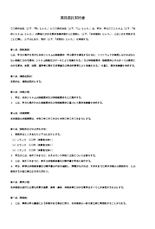 業務委託契約書 〇〇株式会社(以下、「甲」という。)と〇〇株式会社(以下、「乙」という。)は、甲が、甲の○○システム(以下、「本件システム」という。)の開発にかかる要件定義作業を乙に委託し(以下、「本件業務」という。)、乙はこれを受託することに関し、以下のとおり、契約(以下、「本契約」という。)を締結する。 第1条(委託業務) 乙は、甲から提示を受けた本件システムの機能要件(甲の要求を満足するために、ソフトウェアが実現しなければならない機能にかかる要件。システム機能及びデータにより定義される。)及び非機能要件(機能要件以外のすべての要素にかかる要件。品質、性質、運用等に関する目標値及び具体的事項により定義される。)を基に、要件定義書を作成する。 第2条(準委任契約) 本契約は、準委任契約とする。 第3条(作業分担) 1 甲は、本件システムの機能要件及び非機能要件を乙に提示する。 2 乙は、甲から提示された機能要件及び非機能要件に基づいて要件定義書を作成する。 第4条(作業期間) 本件業務の作業期間は、令和〇年〇月〇日から令和〇年〇月〇日までとする。 第5条(委託料及びその支払方法) 1 委託料は1人月あたり以下のとおりとする。 (1)Aランク 〇〇円(消費税を除く) (2)Bランク 〇〇円(消費税を除く) (3)Cランク 〇〇円(消費税を除く) 2 甲及び乙は、毎月○日までに、次月のランク別投入工数について合意をする。 3 乙は、毎月○日までに、前月の作業報告書及び請求書を甲宛に発行する。 4 甲は、前項の作業報告書及び請求書の内容を確認し、問題がなければ、月末日までに前月作業分の委託料を、乙の指定する口座に振込む方法で支払う。 第6条(費用分担) 本件業務の遂行に必要な旅費交通費、器具・備品、消耗品等にかかる費用はすべて乙が負担するものとする。 第7条(再委託) 1 乙は、事前の甲の書面による承諾がある場合に限り、本件業務の一部を第三者に再委託することができる。 2 甲が前項の承諾を拒否するには、合理的な理由を要するものとする。 3 乙が、第1項の承諾に関して、甲に対して再委託開始時期の○日前までに当該再委託先の名称及び住所等を記載した書面による再委託承諾申請を通知し、甲から当該通知受領後○日以内に具体的理由を明記した書面による承諾拒否の通知がない場合、甲は当該再委託を承諾したものとみなす。 4 乙は当該再委託先との間で、再委託にかかる業務を遂行させることについて、本契約に基づいて乙が甲に対して負担するのと同様の義務を、再委託先に負わせる契約を締結するものとする。 5 乙は、再委託先の履行について甲に帰責事由がある場合を除き、自ら業務を遂行した場合と同様の責任を負うものとする。但し、甲の指定した再委託先の履行については、乙に故意又は重過失がある場合を除き、責任を負わない。 6 再委託先がさらに再委託をする場合も同様とする。 第8条(責任者) 1 甲及び乙は、それぞれ本件業務に関する責任者を選任し、本契約締結後速やかに相手方に通知するものとする。 2 甲及び乙は、責任者を変更する場合は、事前に書面により相手方に通知しなければならない。 3 甲及び乙の責任者は、本契約に定められた甲及び乙の義務の履行その他本件業務の遂行に必要な意思決定、指示、同意等をする権限及び責任を有する。 第9条(主任担当者) 1 甲及び乙は、本契約締結後速やかに、責任者の下に連絡確認及び必要な調整を行う主任担当者を1名又は複数名選任し、書面により、相手方に通知するものとする。 2 甲及び乙は、主任担当者を変更する場合は、速やかに書面により相手方に通知しなければならない。 3 甲及び乙は、本契約に定めた事項のほか、本件業務遂行に関する相手方からの要請、指示等の受理及び相手方への依頼、その他日常的な相手方との連絡、確認等は責任者又は主任担当者を通じて行うものとする。 第10条(連絡協議会) 1 甲及び乙は、本件業務の進捗状況、未決定事項の解決等、必要事項を協議し、決定するため、連絡協議会を開催するものとする。 2 連絡協議会は、原則として、月1回の頻度で定期的に開催するものとし、それに加えて、甲又は乙が必要と認める場合に随時開催するものとする。 3 連絡協議会には、甲乙双方の責任者、主任担当者及び責任者が適当と認める者が出席する。 4 甲及び乙は、本件業務の遂行に関し連絡協議会で決定された事項について、本契約に反しない限り、これに従う義務を負う。 5 乙は、連絡協議会の議事内容及び結果について、書面により議事録を作成し、甲乙双方の責任者が承認するものとする。 第11条(要件定義書) 要件定義書の作成を完了した場合、甲及び乙は、要件定義書の記載内容が本件システムの要件定義として必要事項を満たしていることを確認し、確認できた場合は、甲乙双方の責任者が承認するものとする。 第12条(資料の提供・管理等) 1 乙は、甲に対し、本件業務の遂行に必要な資料等について、開示を求めることができる。甲