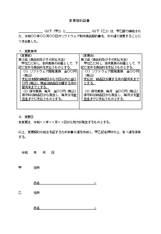(以下「甲」)と (以下「乙」)は、甲乙間で締結された、令和○○年○○月○○日付ソフトウェア制作委託契約書を、次の通り変更することにつき合意した。