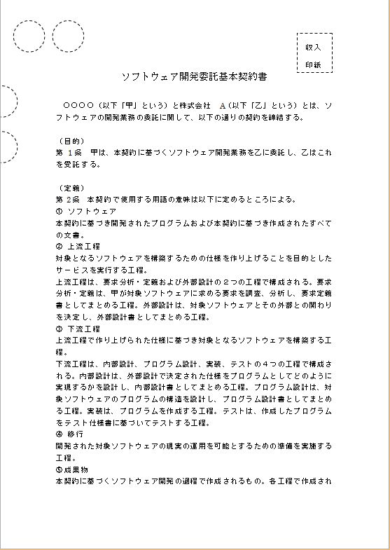 ○○○○(以下「甲」という)と株式会社 A(以下「乙」という)とは、ソフトウェアの開発業務の委託に関して、以下の通りの契約を締結する。