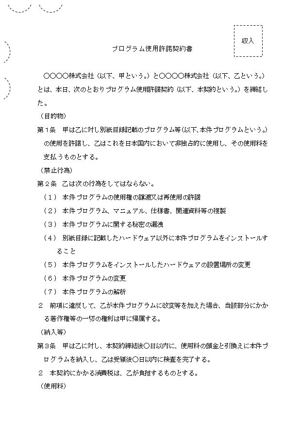 ○○○○株式会社(以下、甲という。)と○○○○株式会社(以下、乙という。)とは、本日、次のとおりプログラム使用許諾契約(以下、本契約という。)を締結した。