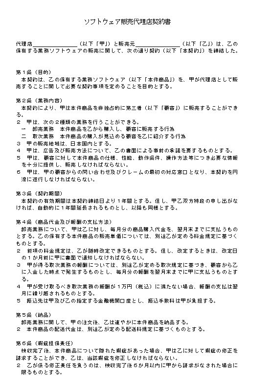 ソフトウェア販売代理店契約書 代理店 (以下「甲」)と販売元 (以下「乙」)は、乙の保有する業務ソフトウェアの販売に関して、次の通り契約(以下「本契約」)を締結した。 第1条(目的) 本契約は、乙の保有する業務ソフトウェア(以下「本件商品」)を、甲が代理店として販売することに関して必要な契約事項を定めることを目的とする。 第2条(業務内容) 本契約により、甲は本件商品を非独占的に第三者(以下「顧客」)に販売することができる。 2 甲は、次の2種類の業務を行うことができる。 一 卸売業務 本件商品を乙から購入し、顧客に販売する行為 二 取次業務 本件商品の購入が見込める顧客を乙に紹介する行為 3 甲の販売地域は、日本国内とする。 4 甲は、広告及び販売方法について、乙の書面による事前の承諾を要するものとする。 5 甲は、顧客に対して本件商品の仕様、性能、動作条件、操作方法等につき必要な情報を十分に提供し、販売しなければならない。 6 甲は、甲の顧客からの問い合わせ及びクレームの最初の対応窓口となり、本契約を円滑に遂行しなければならない。 第3条(契約期間) 本契約の有効期間は本契約締結日より1年間とする。但し、甲乙双方特段の申し出がなければ、自動的に1年間延長されるものとし、以降も同様とする。 第4条(商品代金及び報酬の支払方法) 卸売業務について、甲は乙に対し、毎月分の商品購入代金を、翌月末までに支払うものとする。乙の保有する本件商品の販売単価については、別途乙が定める料金規定に基づくものとする。 2 前項の料金規定は、乙が随時改定できるものとする。但し、改定するときは、改定日の1か月前に甲に書面で通知しなければならない。 3 甲が得る取次業務の報酬については、別途乙が定める取次規定に基づき、顧客から乙に入金した時点で発生するものとし、毎月分の報酬を翌月末までに甲に支払うものとする。 4 甲が受け取るべき取次業務の報酬が1万円(税込)に満たない場合、報酬の支払は翌月に繰り越されるものとする。 5 振込先は甲及び乙の指定する金融機関口座とし、振込手数料は甲が負担する。 第5条(納品) 卸売業務に関して、甲の注文後、乙は速やかに本件商品を納品する。 2 本件商品の配送代金は、別途乙が定める配送料規定に基づくものとする。 第6条(瑕疵担保責任) 検収完了後、本件商品について隠れた瑕疵があった場合、甲は乙に対して瑕疵の修正を請求することができ、乙は、当該瑕疵を修正しなければならない。 2 乙が係る修正責任を負うのは、検収完了後6か月以内に甲から請求がなされた場合に限るものとする。 第7条(著作権) 本件商品に関する著作権は、納品後も、乙に帰属するものとする。 2 前項の権利には、著作権法第27条に定める「著作物を翻訳し、編曲し、もしくは変形し、または脚色し、その他翻案する権利」及び著作権法第28条に定める「二次的著作物の利用に関する原著作者の権利」を含むものとする。 第8条(秘密情報の取扱い) 甲及び乙は、本件業務遂行のため相手方より提供を受けた技術上または営業上その他業務上の情報のうち、相手方が書面により秘密である旨指定して開示した情報、または口頭により秘密である旨を示して開示した情報で開示後10日以内に書面により内容を特定した情報を秘密情報と定めるものとする。但し、次の各号のいずれか一つに該当する情報については秘密情報には該当しない。 一 秘密保持義務を負うことなくすでに保有している情報 二 秘密保持義務を負うことなく第三者から正当に入手した情報 三 相手方から提供を受けた情報によらず、独自で開発した情報 四 本契約に違反することなく、かつ、受領の前後を問わず公知となった情報 2 甲及び乙は、秘密情報を第三者に漏洩してはならない。但し、事前に相手方からの書面による承諾を受けることにより、第三者へ開示することができる。なお、法令の定めに基づきまたは権限ある官公署から開示の要求があった場合は、当該法令の定めに基づく開示先に対し開示することができる。 3 秘密情報の提供を受けた当事者は、当該秘密情報の管理に必要な措置を講ずるものとする。 4 甲及び乙は、秘密情報について、本契約の目的の範囲でのみ使用し、本契約の目的の範囲を超える複製、改変が必要なときは、事前に相手方から書面による承諾を受けるものとする。 5 甲及び乙は、秘密情報を本契約の目的のために知る必要のある各自の役員及び従業員に限り開示するものとし、本契約に基づき甲及び乙が負担する秘密保持義務と同等の義務を、秘密情報の開示を受けた当該役員及び従業員に退職後も含め課すものとする。 6 本条の規定は、本契約終了後も存続する。 第9条(個人情報) 甲は、個人情報の保護に関する法律に定める個人情報のうち、本件業務遂行に際して乙より取扱いを委託された個人データまたは、本件業務遂行のため、甲乙間で個人データと同等の安全管理措置を講ずることについて、個別契約その他の契約に