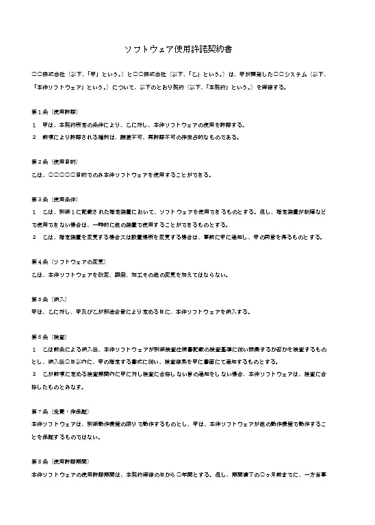 〇〇株式会社(以下、「甲」という。)と〇〇株式会社(以下、「乙」という。)は、甲が開発した〇〇システム(以下、「本件ソフトウェア」という。)について、以下のとおり契約(以下、「本契約」という。)を締結する。