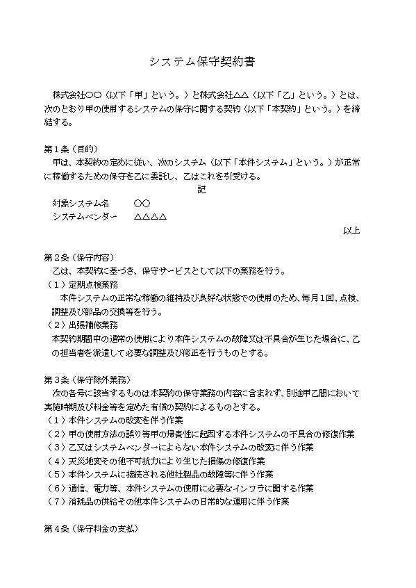 株式会社〇〇(以下「甲」という。)と株式会社△△(以下「乙」という。)とは、次のとおり甲の使用するシステムの保守に関する契約(以下「本契約」という。)を締結する。