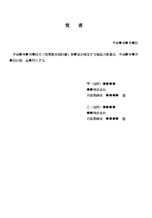 覚 書 平成〇年〇月〇日 平成〇年〇月〇日付「売買基本契約書」第〇条が規定する製品の単価は、平成〇年〇月〇日以降、金〇円とする。 甲(住所)〇〇〇〇 〇〇株式会社 代表取締役 〇〇〇〇 ㊞ 乙(住所)〇〇〇〇 〇〇株式会社 代表取締役 〇〇〇〇 ㊞