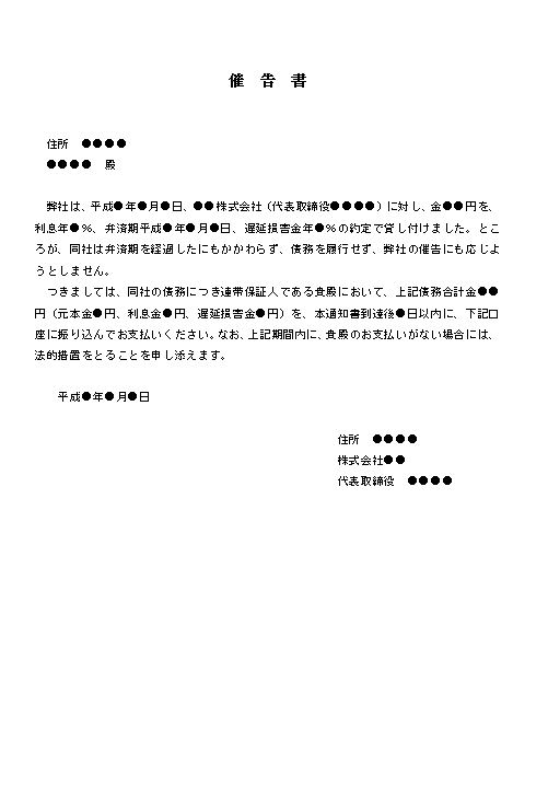 催 告 書 住所 〇〇〇〇 〇〇〇〇 殿 弊社は、平成〇年〇月〇日、〇〇株式会社(代表取締役〇〇〇〇)に対し、金〇〇円を、利息年〇%、弁済期平成〇年〇月〇日、遅延損害金年〇%の約定で貸し付けました。ところが、同社は弁済期を経過したにもかかわらず、債務を履行せず、弊社の催告にも応じようとしません。 つきましては、同社の債務につき連帯保証人である貴殿において、上記債務合計金〇〇円(元本金〇円、利息金〇円、遅延損害金〇円)を、本通知書到達後〇日以内に、下記口座に振り込んでお支払いください。なお、上記期間内に、貴殿のお支払いがない場合には、法的措置をとることを申し添えます。 平成〇年〇月〇日 住所 〇〇〇〇 株式会社〇〇 代表取締役 〇〇〇〇